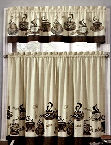 Coffee Cups Java Kitchen Window Curtain set. Kitchen Curtain set consist of 2 curtain tiers each 54" X 36" and one Caf?? Valance 54" X 14". Machine washable for easy cleaning
