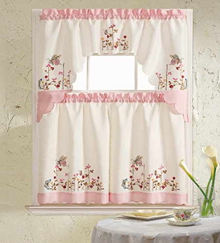 B&H Home Pink Butterfly Embroidered 3-Piece Kitchen Curtain Window Treatment Set