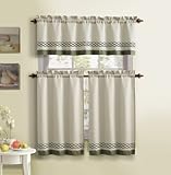 Nanshing Dionne multi piece window set is a taupe panel pair with an embroidered valance. The set includes a pair of attached sheer under panels and two braided rope tie backs. Also matches Dionne bedding.